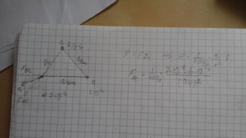 I hörnen på en liksidig triangel med sidlängd 0.4 m finns laddningarna A med värdet 7 *10^(-6) C, B med värdet 6 *10^(-6) C och C med värdet 6 *10^(-6) C.