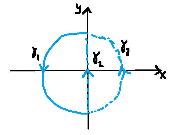Angående den här biten brukar det vara att man själv väljer hur man vill utöka kurvan, det finns trots allt många sätt att sätta ihop kurvan på, men vissa sätt kommer ge enklare areor och kurvintegraler. Tänk dig att vi ska räkna med ett vektorfält över kurva 1 och vill använda greens sats. Två sätt att bilda den slutna kurvan skulle kunna vara att göra utökningen mha kurva 2 eller att fortsätta på cirkeln tills den sluts med kurva 3.