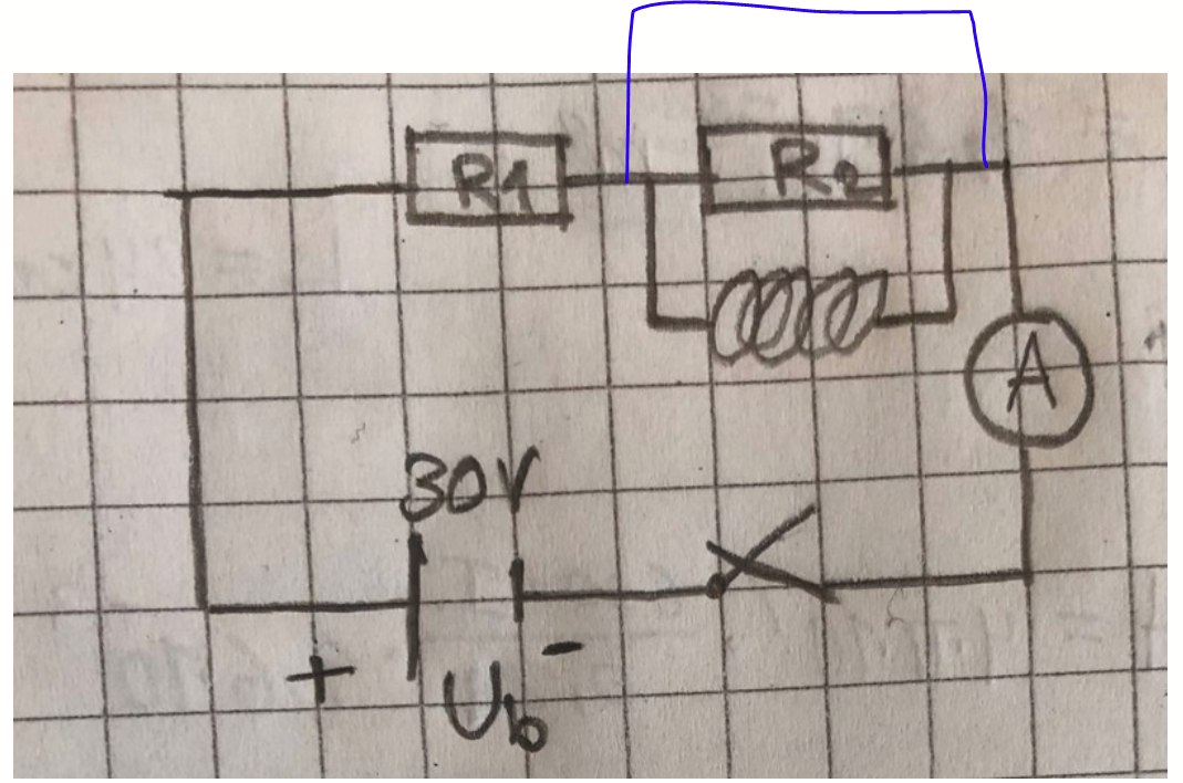 Om spolen var parallellt koppad med R1 skulle den inte släppa någon ström precis efter tillslaget. Då går all ström genom R1 och I ska enligt amperemetern vara 1*10-3.