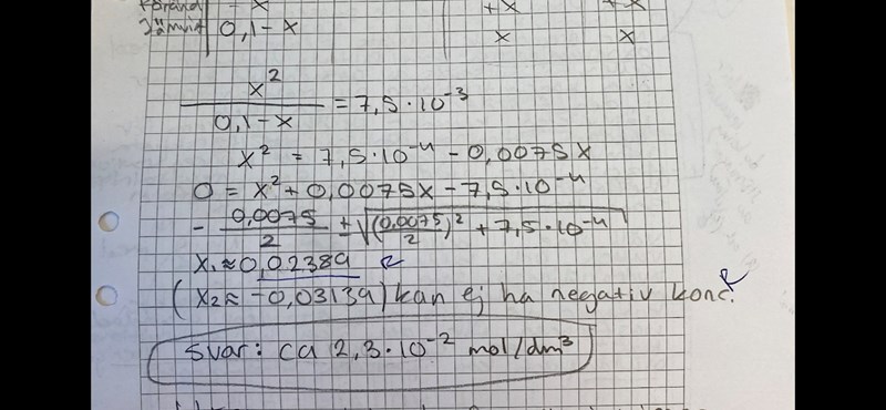 Är det inte så att om det är en svag syra så spelar -x i nämnaren ingen roll? Men när jag testar att räkna utan det får jag inte samma svar