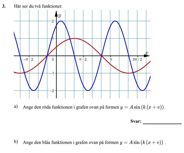 Den röda funktionen ovan är förskjuten pi/3 i x-led vilket betyder att den är y = A sin (x - pi/3), dvs v = -pi/3