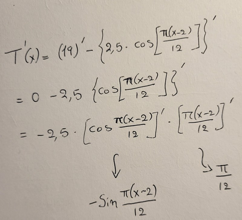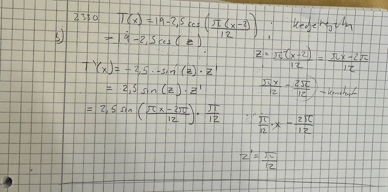 Det gäller att titta på var variabeln är och vad som är i dess omgivning. I detta fall ser vi att x är inuti en cosinusfunktion. Därför behöver vi använda kedjeregeln. Den inre funktionen innehåller bara ett x alltså inget bråk av flera x eller ingen produkt av flera x, och således behövs ingen produkt- eller kvotregel.