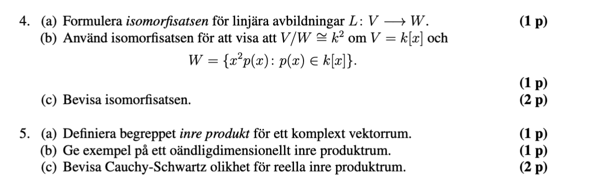 På uppgifter om isomorfisatsen kan det vara bra att tänka på det faktum att alla (ändligdimensionella) delrum till ett vektorrum är kärnan för någon linjär avbildning. På uppgift 4b när man ska visa att så bör strategin vara att försöka hitta en linjär avbildning sådan att . Ett tips när det gäller polynom är att , , och så vidare.