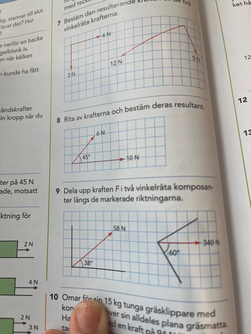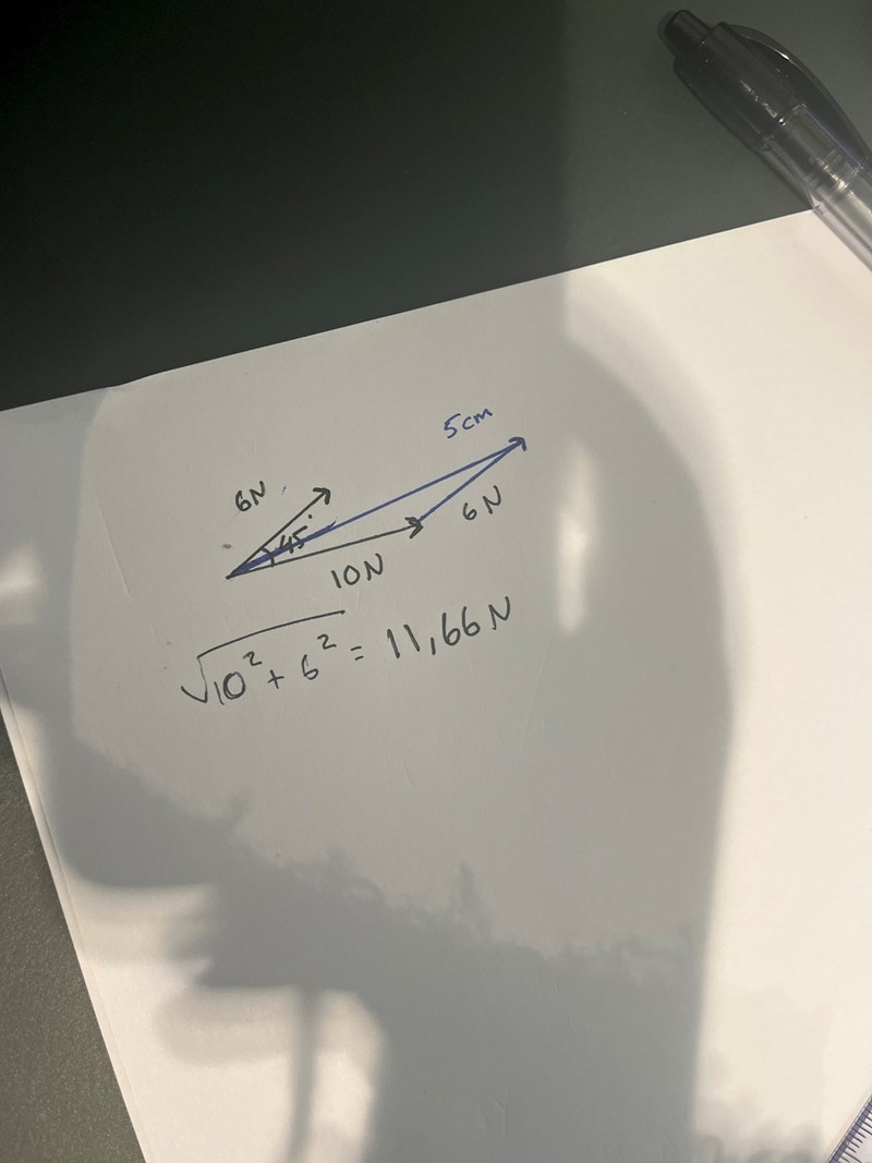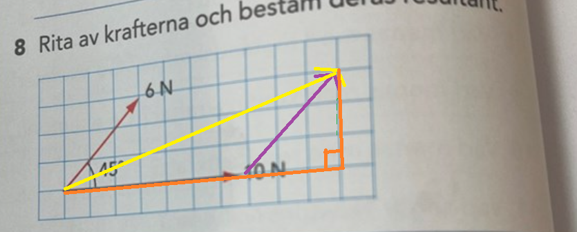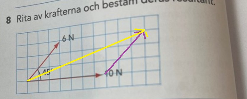 Resultanten får du genom att sätta den ena kraften efter den andra. Det spelar ingen roll vilken du väljer. Här har jag tagit den lilla 6N-kraften och satt där 10N-kraften slutar. Den är inritad med lila färg. 45 grader, tre rutor åt höger, tre rutor uppåt.