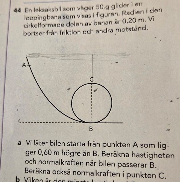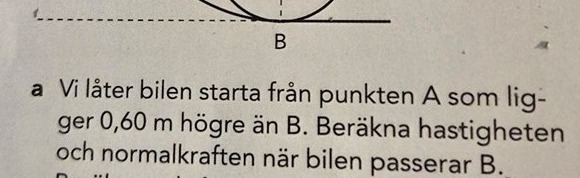 Men det konstiga i bokens lösning är att de lägger r=0,2 meter. Men jag ser det som att den befinner sig i cirkelrörelse ju redan vid höjden 0,6 meter och i en cirkelrörelse med r=0,6 meter, så i punkt B borde ju inte r=0,2 meter?? Den har ju inte ens börjat en cirkelrörelse i den mindre cirkeln vid punkt B? Kan någon förklara?