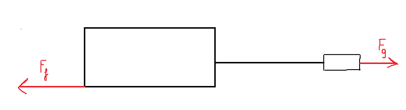 För att bestämma systemets acceleration behöver du bara titta på dess externa krafter. Dessa är i vårt fall friktionskraften på lådan och tyngdkraften på trissan. Trissan gör om rörelse i -led till rörelse i -led, så situationen kan ritas helt horisontellt om det hjälper: