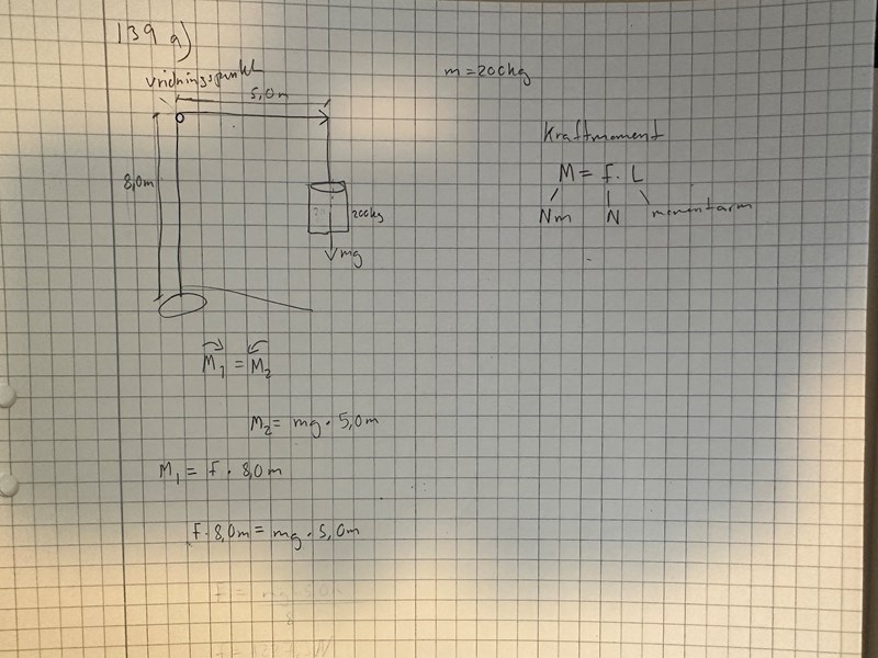 eller på b) så blir markfästet momentpunkten(vridningpunkt)… och då har man momentarmen 5 m, men F?