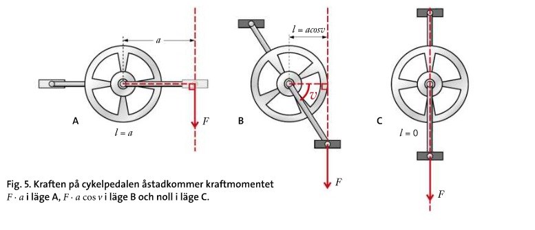 "Visa att du kan använda den mot trampaxeln vinkelräta komposanten av kraften F i fig. 5b och få samma resultat för kraftmomentet". Menar dem att man ska uttrycka kraftmomentet med sinus istället? sin v = (a*cosv)/a, dvs. sin v = cos v??