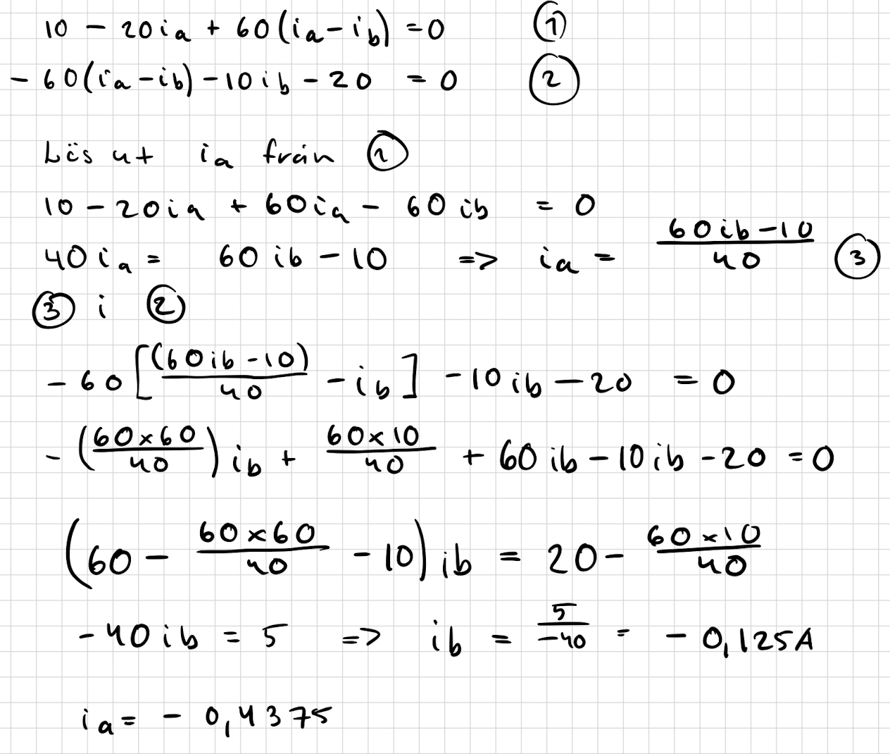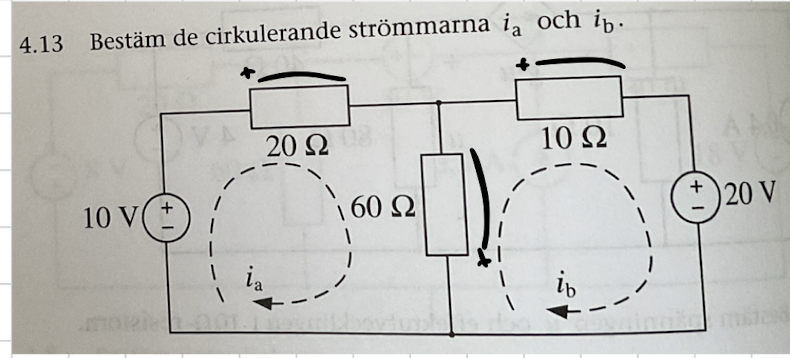 Rent sponant tänker jag: I mitt fall är strömmen över 60-ohm resistorn är riktad uppåt och går i samma riktning som ib. Därav borde strömmen upp (över 60-ohm resistorn) vara (ib - ia). För den första maskan (ia) så går man i "motsatt riktning" över resistorn, och strömmen blir därför - (ib - ia) = (ia - ib). För den andra maskan så går man i "rätt" riktning, och strömmen blir (ib - ia). Detta blir dock inte rätt - och är motsatsen till ditt förslag om jag ser det rätt.