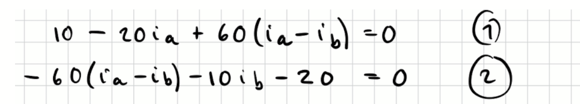 När vi går runt i vänstra maskan går vi med ia genom 60-ohmaren och får vi potentialskillnad -60ia och mot strömmen ib, som ger +60ib.