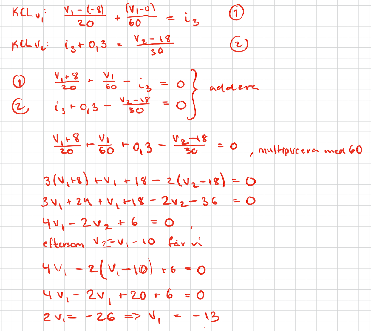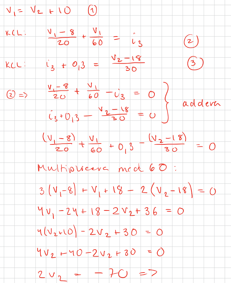 Jag har svårt med att se hur denna krets resulterar i v1 = 8,33 samt v2 = -1,67. Jag har testat lösa uppgiften direkt, samt genom att definiera en supernod mellan v1 och v2, och även med flera riktningar på in/utgående strömmar. Jag kommer antingen fram stora värden på v1 och v2, eller att kretsen saknar lösning (ex. 50 = 0). Oavsett hur jag försöker lösa uppgiften så får jag inte fram samma resultat som i facit. Bifogar ett av mina lösningsförsök..