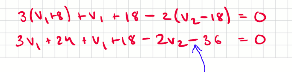 Strömriktningarna är antagna som de röda pilarna indikerar. Summa ström in till 10 V spänningskällan är då lika med summan av strömmarna ut därifrån. Potentialen på högersidan om 30 ohms resistansen är +18 V och på vänstersidan v2, så med antagen strömriktning är den (18-v2)/30 ampere.