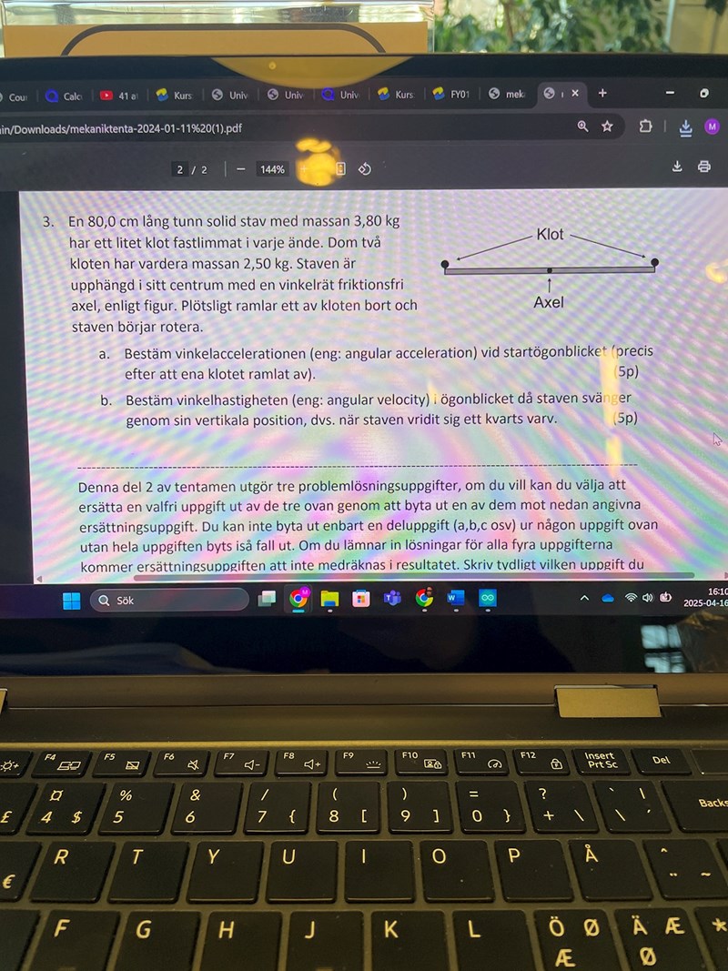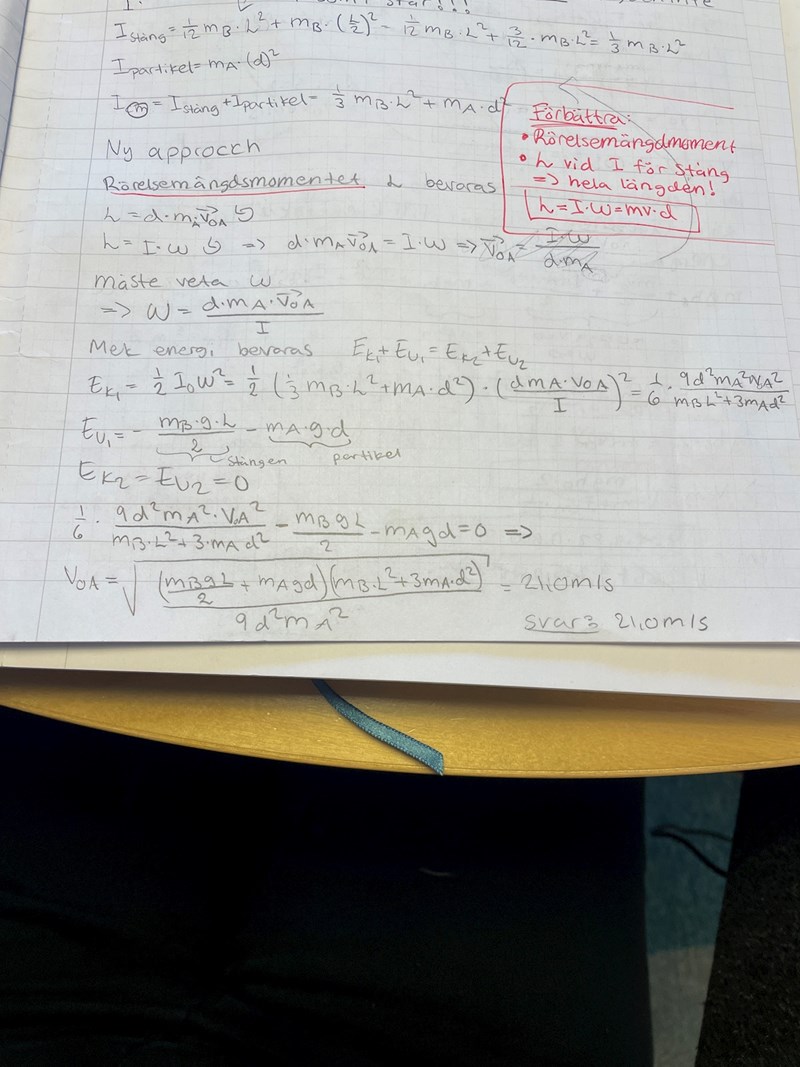 Hej jag har två olika men ändå lite lika uppgifter I första uppgiften var lägesenergin för stång+partikel uppdelade till U=mBg*(L/2)+mAgd där första är stång och andra partikel. Medan i andra uppgiften är lägesenergin endast ”partikel” (i detta fall en boll). Varför ska man inte ha med lägesenergin för stången också? Jag tänkte alltså att det skulle vara U=msg(L/2)+mkg(L/2) men det ska endast vara U=mkg(L/2). Varför är det olika och hur vet man när man ska ha båda och inte?