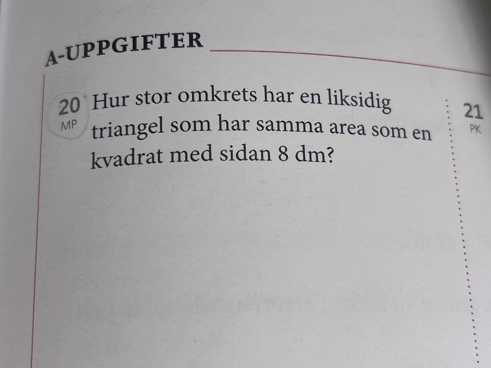 Du har rätt i att vi inte vet vad höjden är, men man kan fortfarande rita ut sträckan som höjden representerar för att underlätta lösandet av uppgiften. Vilka vinklar har de rätvinkliga trianglarna som uppstår?