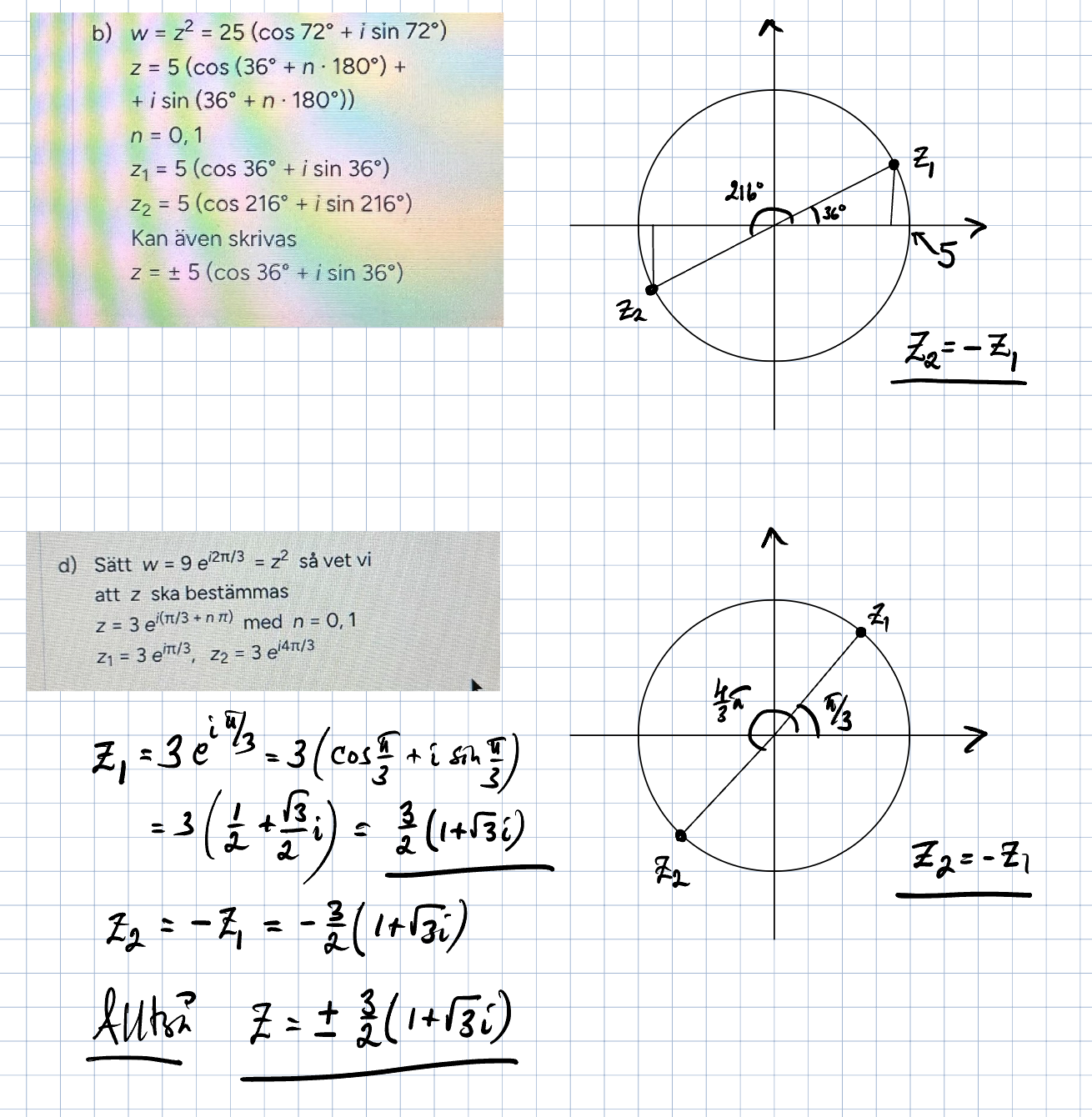 user54321 skrev:Hej jag förstår inte varför kan svaret till b sammanfattas till +- men inte svaret i d,,, båda lösningarna är ju 180 grader / pi ifrån varandra ?