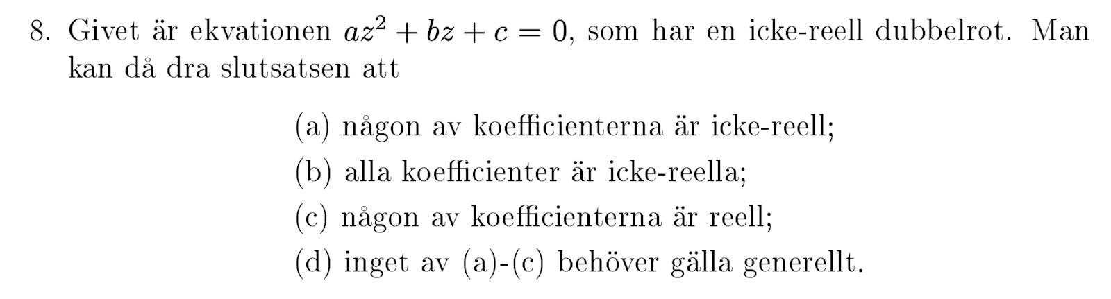 Ja, man skulle kunna sätta ett i framför dubbelroten eller en parentes multiplicerat med dubbelroten. Men Oavsett vad, jag kan inte få fram en enda situation då någon av koefficienterna inte är reella. Varför kan inte svaret vara c) Varför just a) ?