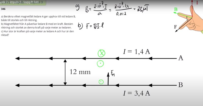 Den gröna symbolen (cirkel med prick) intill ledare B, visar hur magnetfältet från ledare A är riktat, intill ledare B. Dvs det är svaret på a-uppgiften.