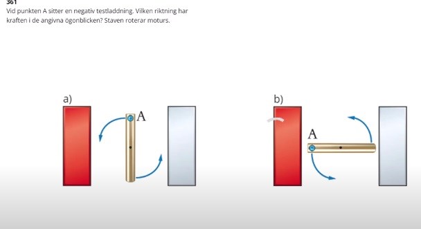 I ögonblicksbilden, i bild A rör sig den negativa laddningen åt vänster. Vad är då strömmens riktning?