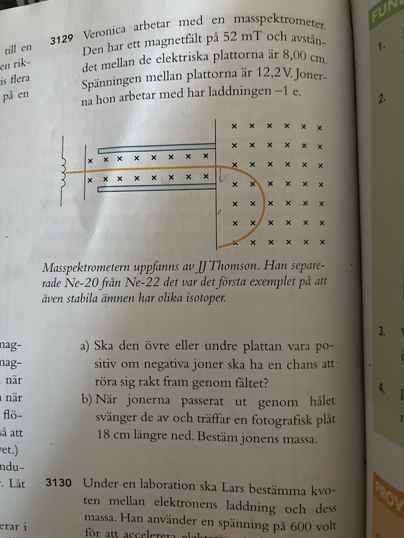 I uppgiften med masspektrometern så vet man att den magnetiska och den elektriska kraften är lika stora på de partiklar som träffar den lilla öppningen, eftersom om krafterna inte var lika stora så skulle partiklarna bana böjas, och de missar öppningen.