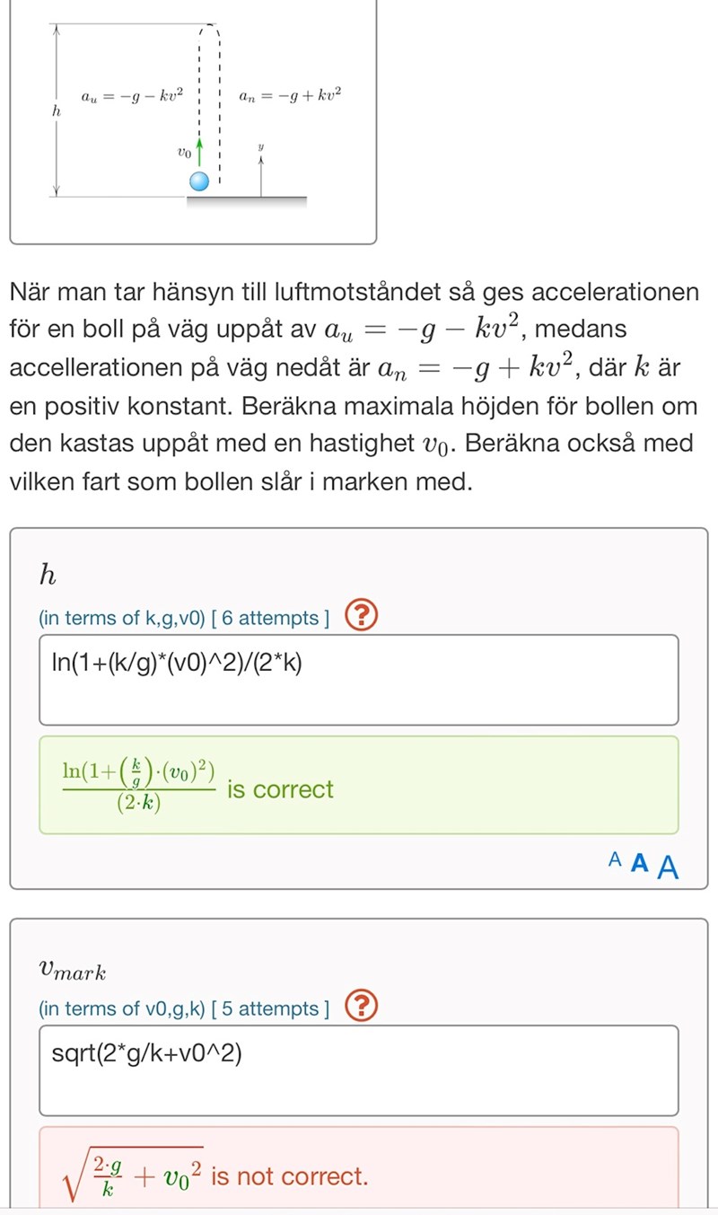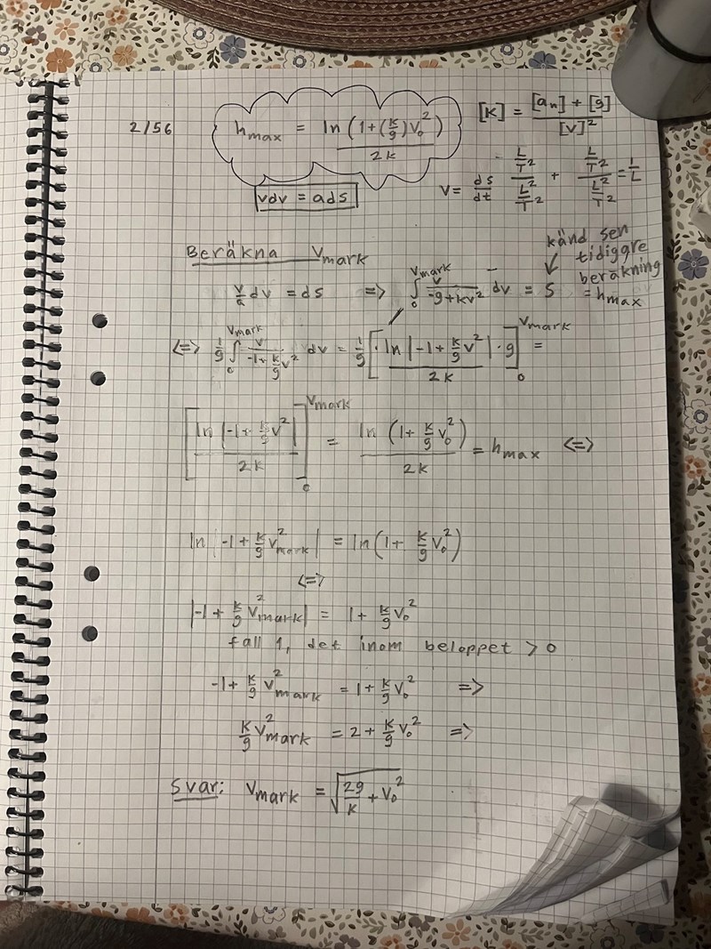 Jag förstår. Stort tack för svar. Det var faktiskt nästan mitt andra försök, fast då fick jag ln(-1+(k/g)*(vmark)^2)/2k =-hmax