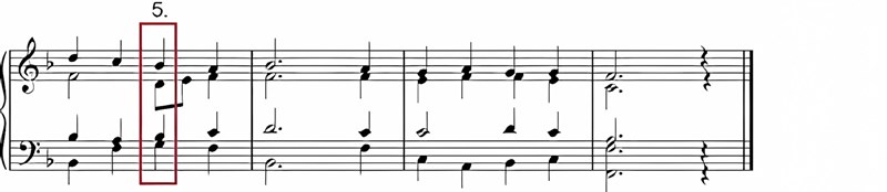5. Vilket ackord bildar tonerna som är inom rektangeln vid siffran 5? Tänk på att det är g-klav och f-klav, och ta hänsyn till fasta förtecken i början av systemet.