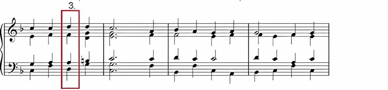 3. Vilket ackord bildar tonerna som är inom rektangeln vid siffran 3? Tänk på att det är g-klav och f-klav, och ta hänsyn till fasta förtecken i början av systemet.