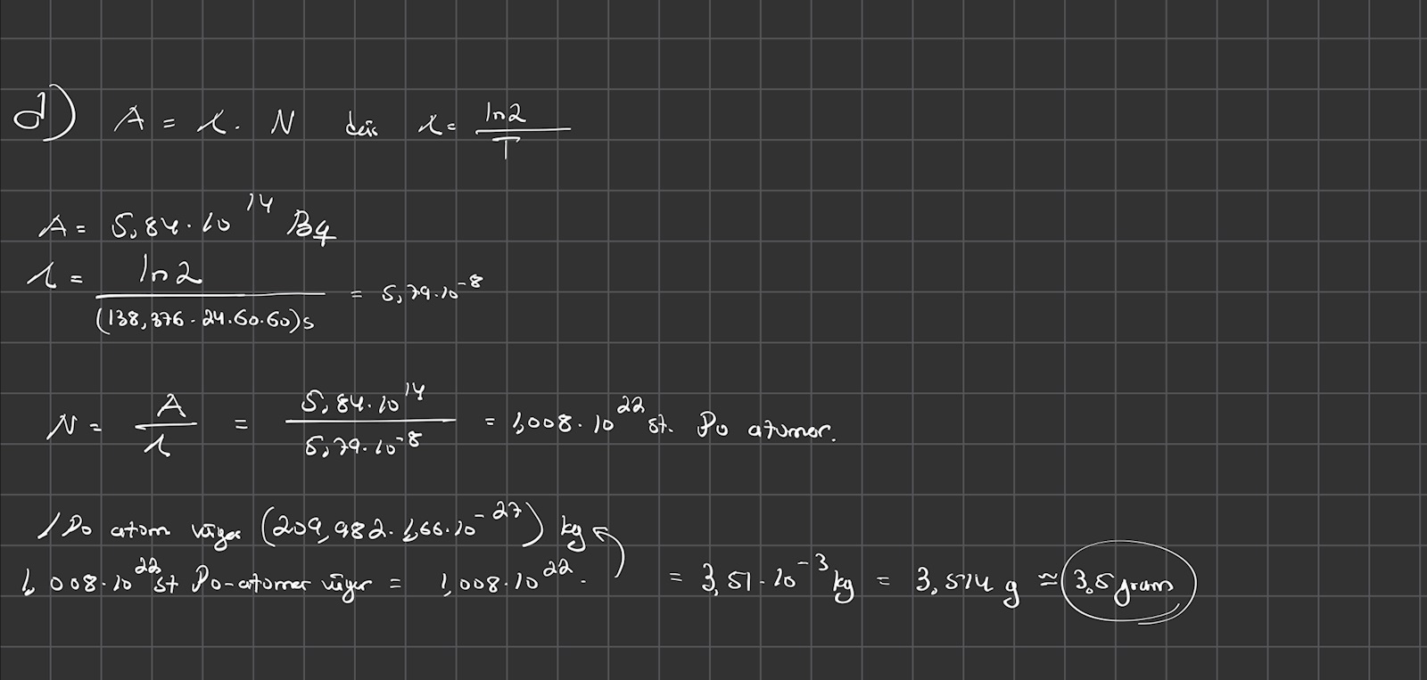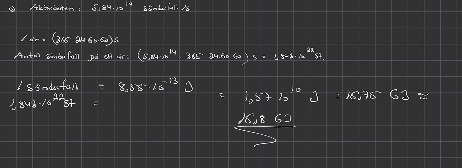 Hej, jag har hittat en svår uppgift om sönderfall och aktivitet på nätet men har inte tillgång till facit. Jag undrar om någon skulle kunna ta sin tid och kolla om jag har gjort rätt. Det hade varit till stor hjälp. Här nedan skickar jag både fråga och svar: