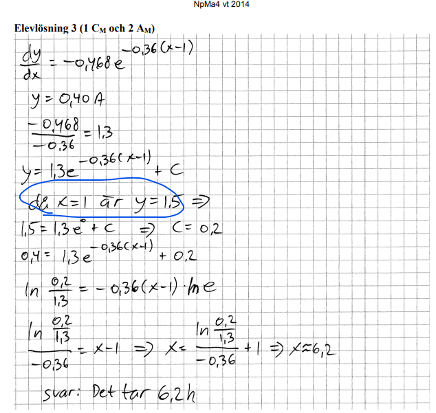 Jag löste ut för t och fick fram att t = 6,2 timmar, vilket stämmer.