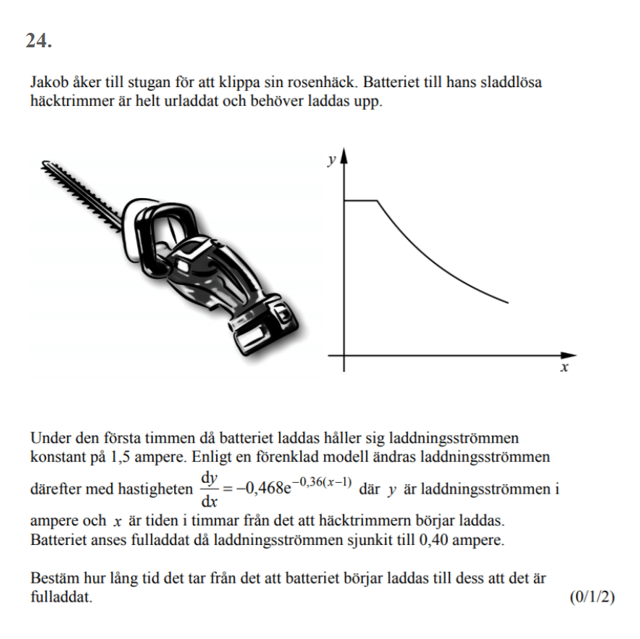 Men det står även i frågan att derivatan endast är det uttrycket när den väl börjar att minska. Lägg märke till att det står "därefter", alltså att efter ett konstant värde på y = 1,5 börjar ett nytt samband att gälla.