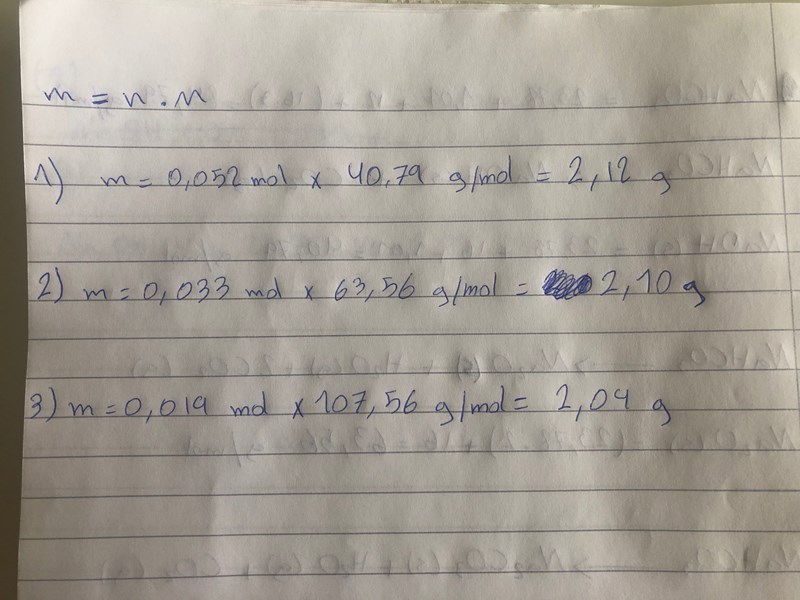 Titta på de tre reaktionsformlerna och fundera ut hur många mol fast återstod det bildas i vart och ett av fallen, och räkna ut vilken massa denna återstod skulle ha. Jämför med den uppvägda massan.