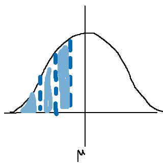 För att de lampor som håller kortast dör först. Vi kan konstatera att eftersom de första hundra glasen måste gå sönder, måste de 15,9 sämsta procenten gå sönder. De fyller ut från vänsterkanten, ända upp till området utanför en (medelvärdet minus en standardavvikelse).