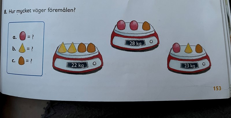 Min dotter i femman har matteprov på måndag. Hon tittar genom uppgifterna de ska kunna och fastnar på följande. Hur hjälper jag henne att RÄKNA ut vad de olika vikterna är?