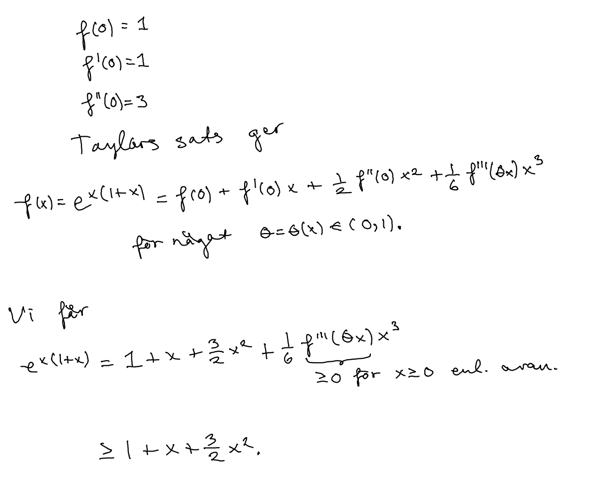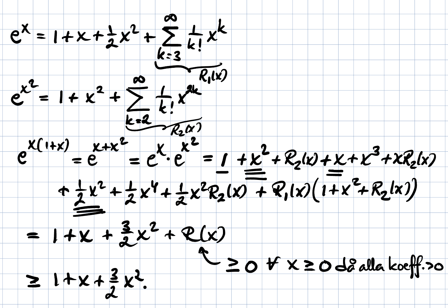 Man kan göra som du, utv x(x+1) och ta det som inargument till serien för e^x. Dock tror jag man bör öva "multiplikation" som jag visar ovan då provkonstruktörer älskar hitta på de mest patologiska produkter och kvoter vars gränsvärde skall bestämmas. Det krävs lite övning i att multiplicera polynom och resttermer "så det går undan" (det mesta försvinner när gradtalet ökar bortom rim och reson) så det kan vara bra om du övar på det också. 98% av alla termer kan man "kasta bort" (eller gruppera i en ny restterm) och det är denna "känsla" som är bra att öva in. Notera hur jag (pedagogiskt) börjar med att skriva produkterna men på slutet slänger jag bara till med R(x) eftersom alla de produkterna har högre gradtal än 2.