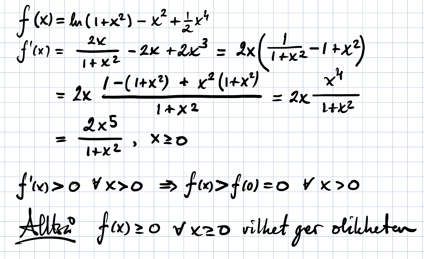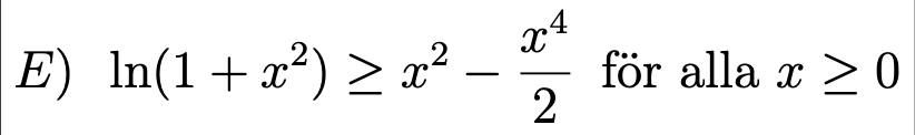 Jag tänkte först att man skulle T-utv. ln(1+x^2) men den är alternerande och det är inte självklart att resttermen är ≥0. En "gymnasieanalys" funkade dock här.