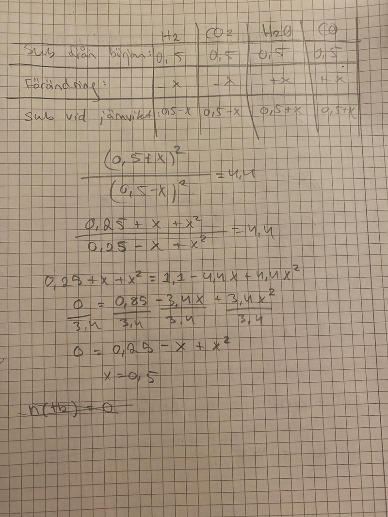 I ett försök blandade man 0,500 mol av vardera gasen i ett kärl med volymen 0,250 dm3. Därefter hettade man upp blandningen till 2000 K och lät jämvikten ställa in sig. Hur stor substansmängd av de fyra gaserna fanns det då?