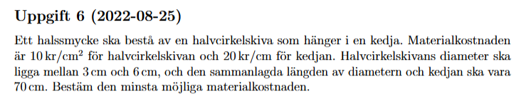 Då f(d) är en positiv parabel så har vi nu hittat den diameter som minimerar materialkostnaden, och denna var utanför det tillåtna intervallet så vi får ta det närmsta tillåtna värdet vilket blir att d=3. Detta ger en kostnad på cirka 1375 kronor.