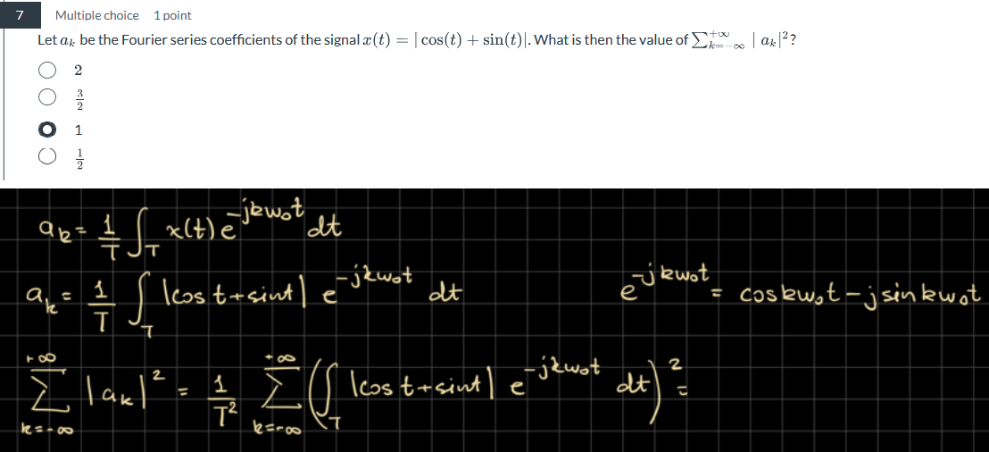 Vet inte riktigt hur jag kan utveckla kvadraten med integralen nedan. Perioden för x(t) verkar vara pi, men hur visar jag detta?