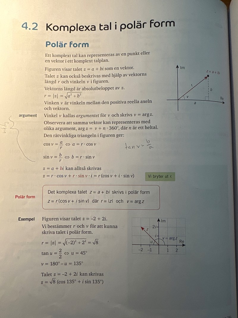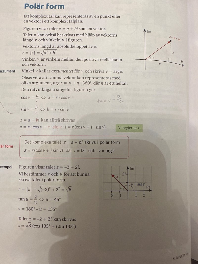 Jag tror att det där vanligtvis kallas exponentiell form, och att det som vanligtvis kallas polär form har formatet z=r(cosv+isinv). För att kunna använda den exponentiella formen av ett komplext tal behöver man först ha gått igenom Eulers formel (kom på mig själv i #7).