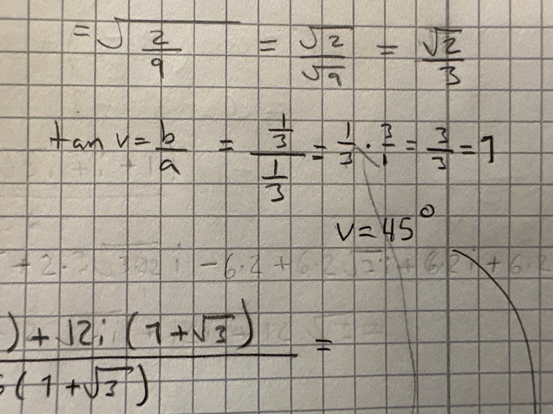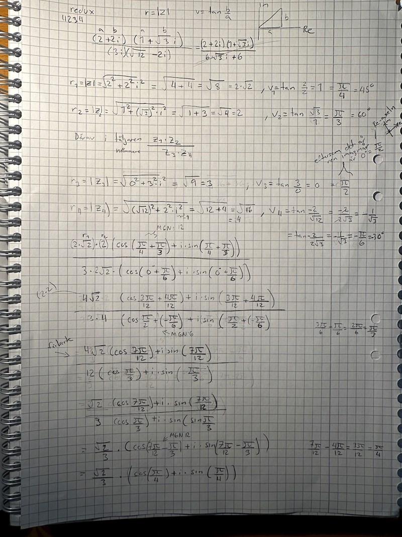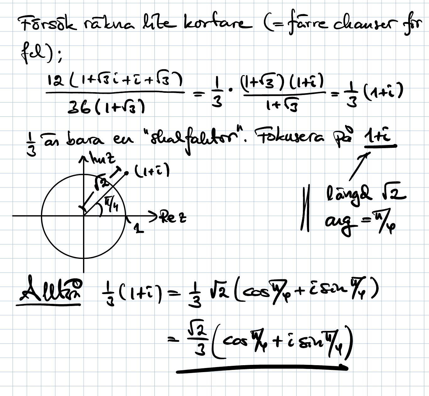 Men bryt då ut 2 från täljare och nämnare och så är du klar, om nu basal aritmetik är tillåtet… Att räkna med polär form är i 99 fall av 100 fullständigt idiotisk IMO.