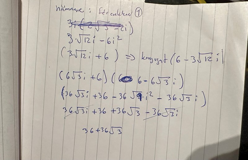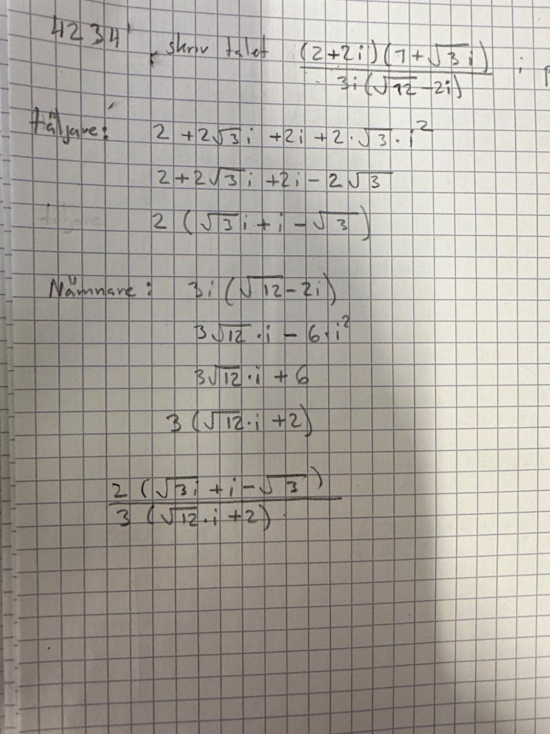 Om du direkt hade multiplicerat med den ursprungliga nämnarens komplexa konjugat skulle du ju ha fått ett reellt heltal. Vad hände?