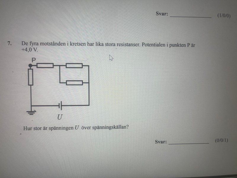 Ledtråden i uppgiften är att man får reda på potentialskillnaden mellan de två punkterna ovanför och nedanför resistorn längst till vänster (jordsymbolen i figuren betyder att potentialen är noll där). Alltså, två punkter i kretsen har potentialskillnaden 4V. Om man antar att resistansen mellan dessa punkter är R, så kommer alltså strömmen som flyter mellan punkterna att bli 4/R ampere genom resistorn.