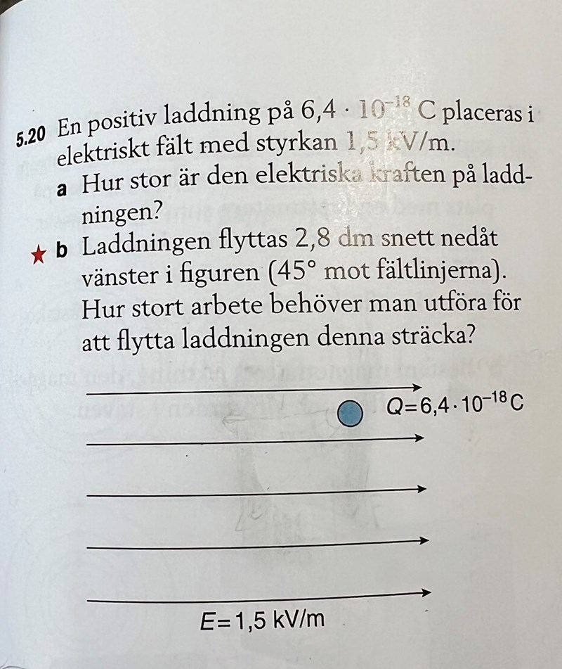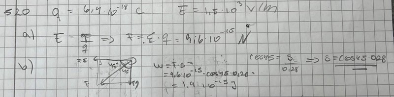 Okej, eftersom arbete bara utförs i fältets riktning måste jag dela in kraften i två komposanter. Och räknar ut den vertikala sträckan. Får då att sträckan blir cos45*0.28. Sedan multiplicerar jag det med kraften jag fick från uppgift a.