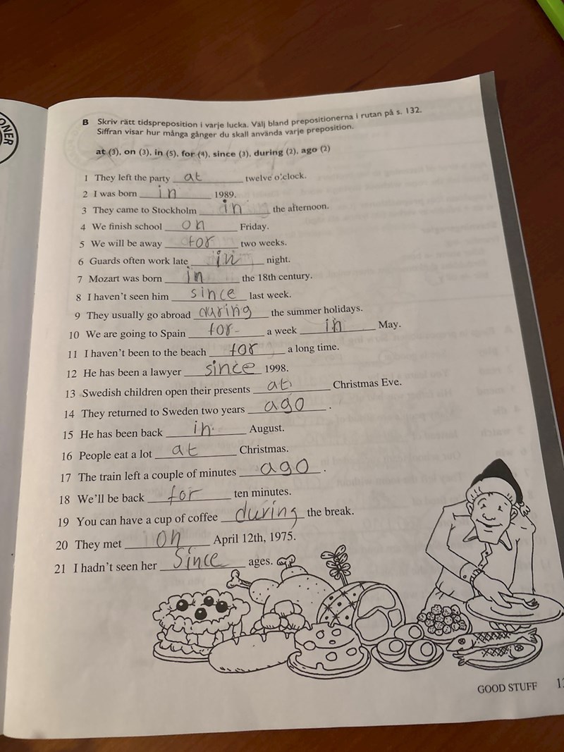 Använd bokens beskrivningar för att avgöra vad som är rätt; jag ser åtminstone 2 fel till (om du inte hittar dem, fråga). Dessutom hjälper siffrorna ovanför ("at" skall ex. användas 3 gånger, men i bilden har det använts 5 gånger). Dessutom ser jag att "ago" inte har använts alls!