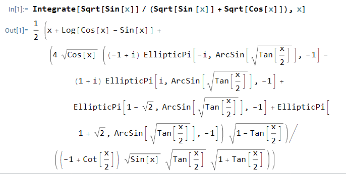 Inte särskilt trevligt (och förmodligen inte särskilt hjälpsamt eftersom EllipticPi är en speciell funktion som definieras av en integral ändå (kan fortfarande vara hjälpsamt, men det är definitivt svårare att hitta denna antiderivata än att lösa integralen som vi gjorde)).