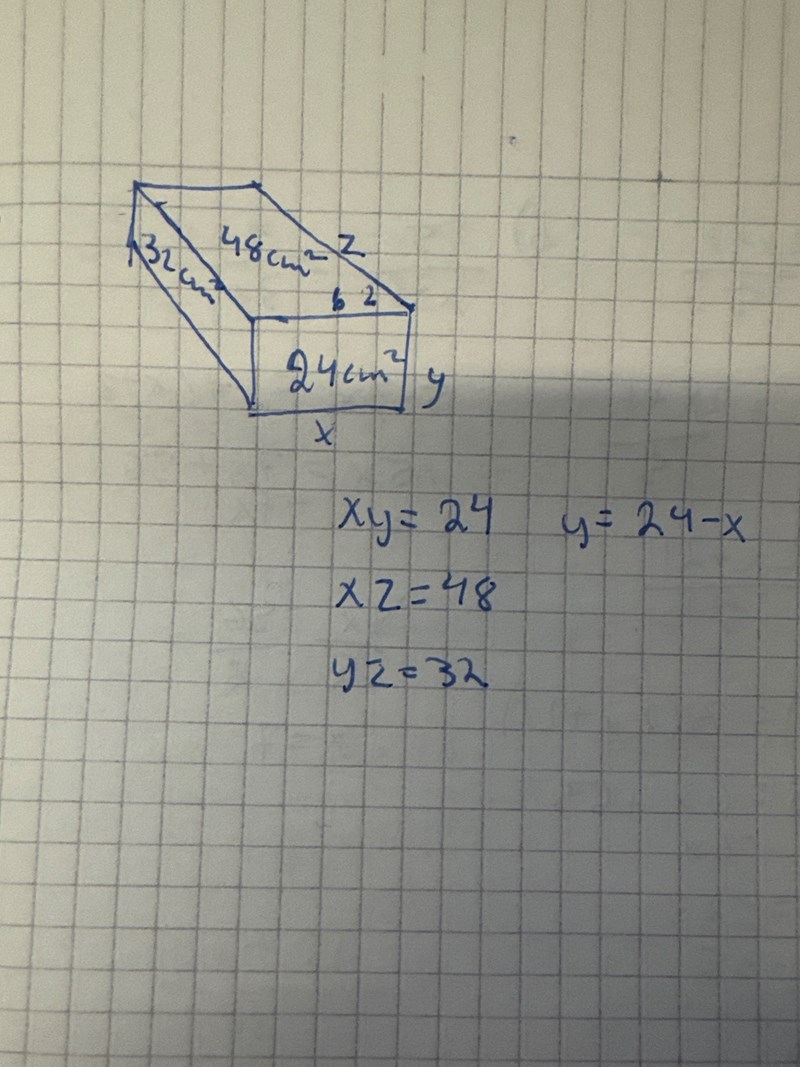 aha, men då var det inte så svårt, jag förstod bara inte varför man skulle multiplicera sidornas ytor med varandra först. Men tack för hjälpen!