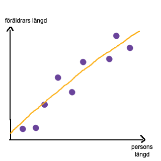 Det kommer aldrig att gå att anpassa en linje som skär alla punkter (vilket är rimligt, med tanke på att det inte finns något exakt samband mellan föräldrars och barns längd), men det är ganska tydligt att det finns ett linjärt samband mellan barn och föräldrars längd. Vi kan approximera denna linje: