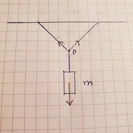 Uppgift: En vikt med massan m hänger i en lätt tråd. Se figur nedan. Tråden är i punkten P fäst i två andra trådar som bildar vinkeln 90° med varandra. Kraften är 16 N i vardera av dessa snett riktade trådar.