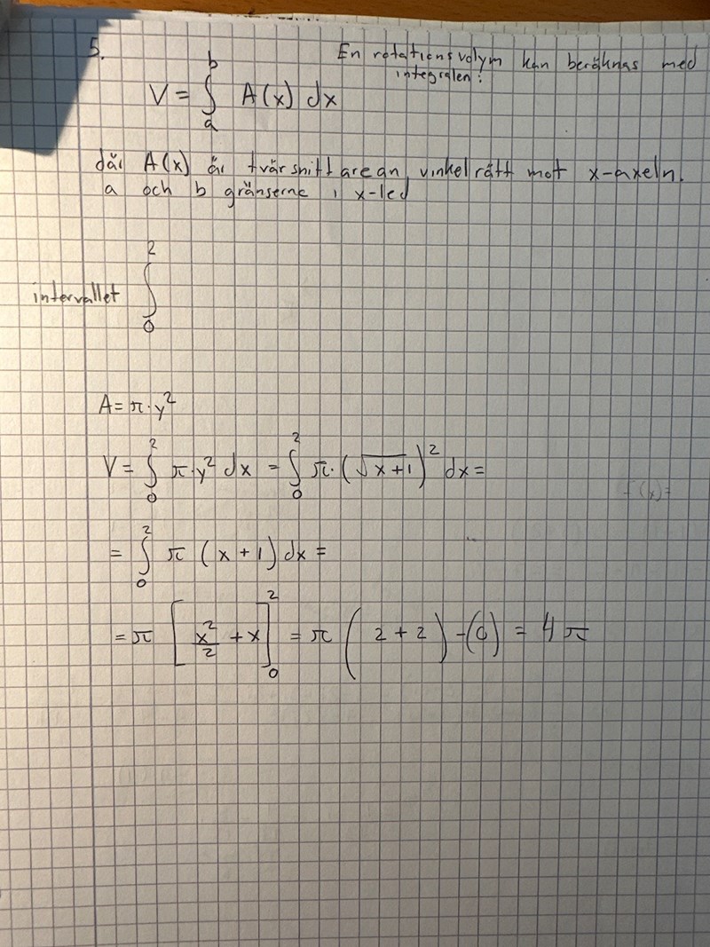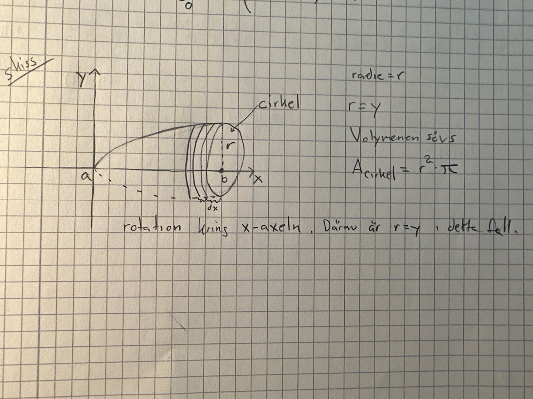 Allt är bra, men jag rekommenderar starkt att du inleder med att skissa grafen till i ett koordinatsystem och att du där även tydligt markerar det område som roterar.