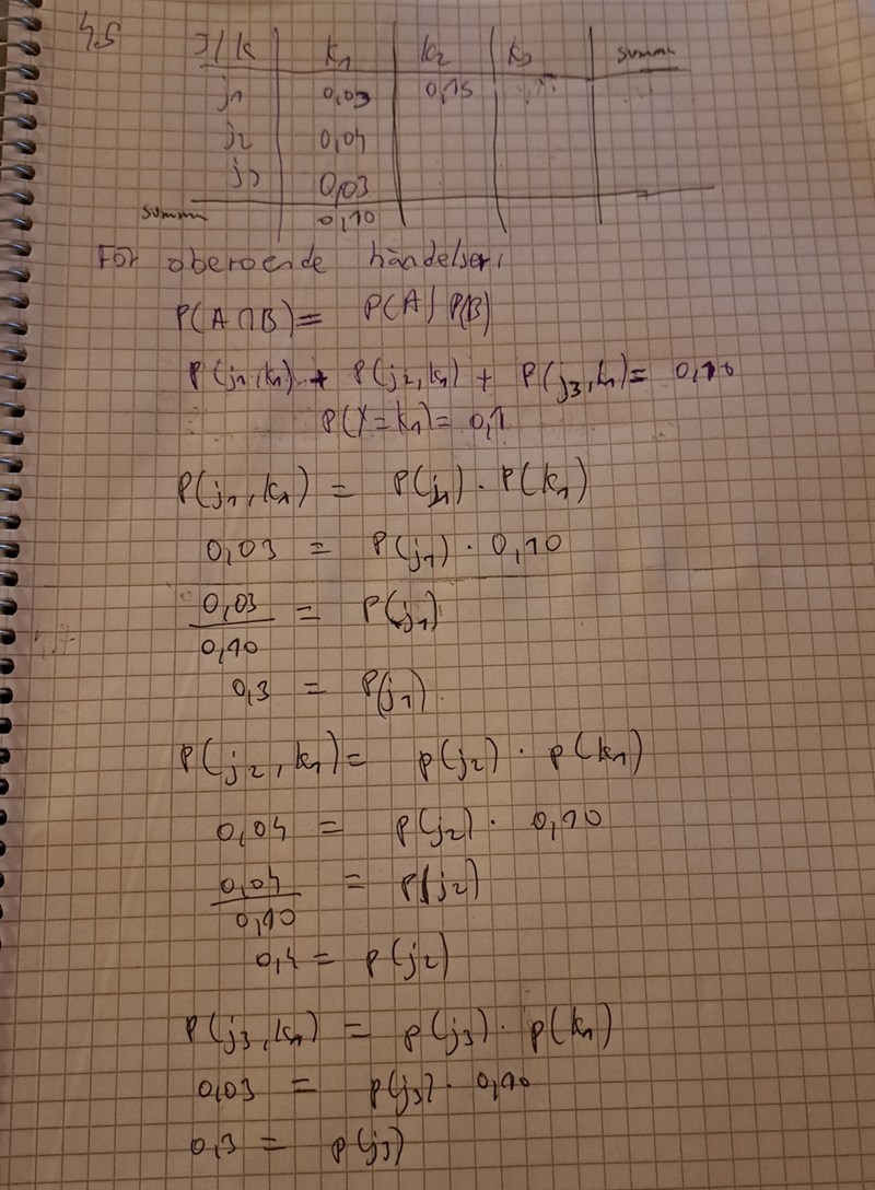 Okej så vi har P(j1,k1)=P(j1)*P(k1). Vi har P(j1,k1) och P(k1) och söker P(j1)