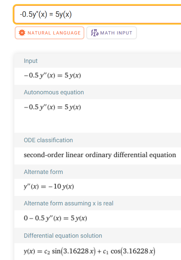 en vikt med massan 0.50 kg hänger i en fjäder som är fäst i taket. Vi drar vikten 0,5 m neråt från jämviktsläget och släpper den. Fjäderkonstanten k=5 N/m. Bestäm ett funktionsuttryck för viktens läge y meter i förhållande till jämviktsläget, som funktion av tiden t i sekunder med hjälp av newtons andra lag.